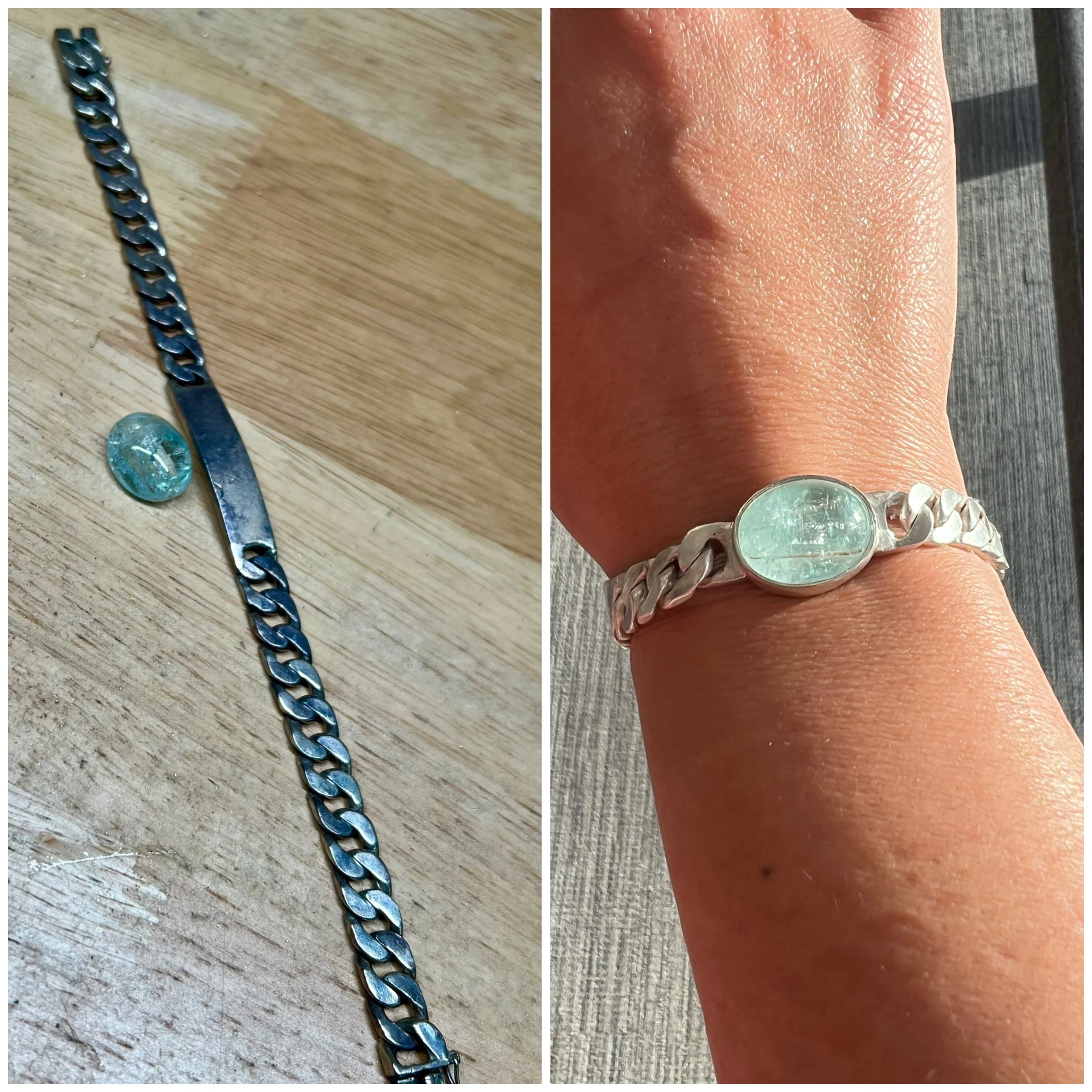 A Silver ID bracelet from a past relationship is transformed with a carefully sourced aquamarine cabochon — lifting the piece, lightening its spirit, and turning lingering memories into something empowering, elegant, and entirely wearable once more.