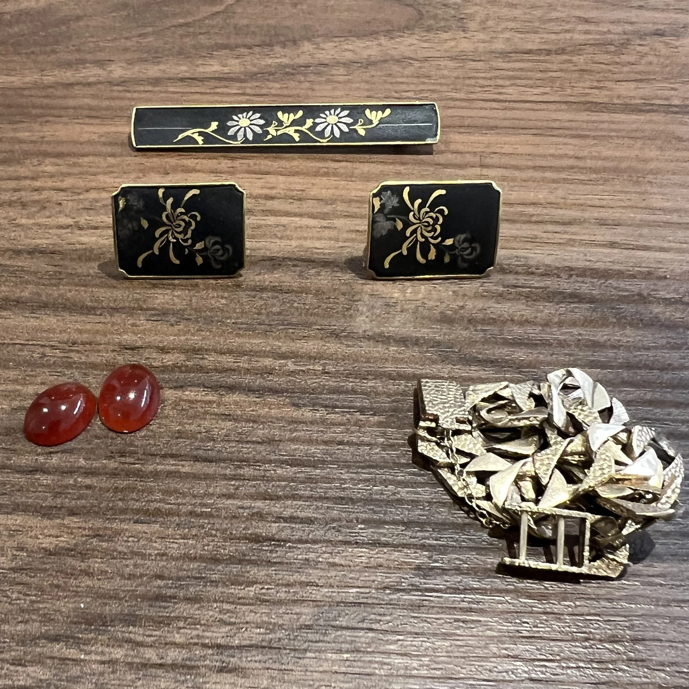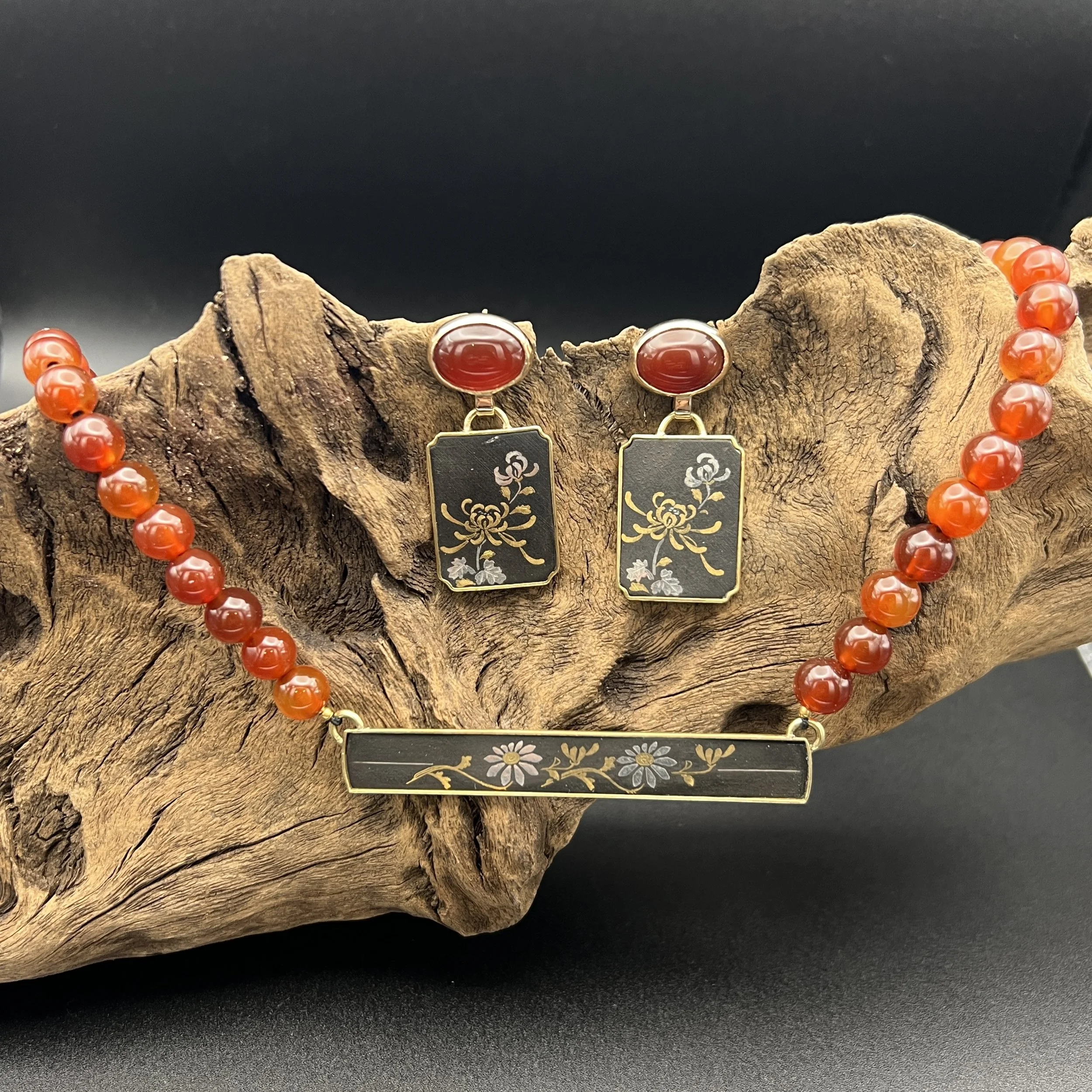 antique Shakudō earrings and brooch, lovingly inherited from a grandmother, were thoughtfully reworked with rich carnelian beads and glowing cabochons — preserving their history while transforming them into elegant, wearable treasures for today.