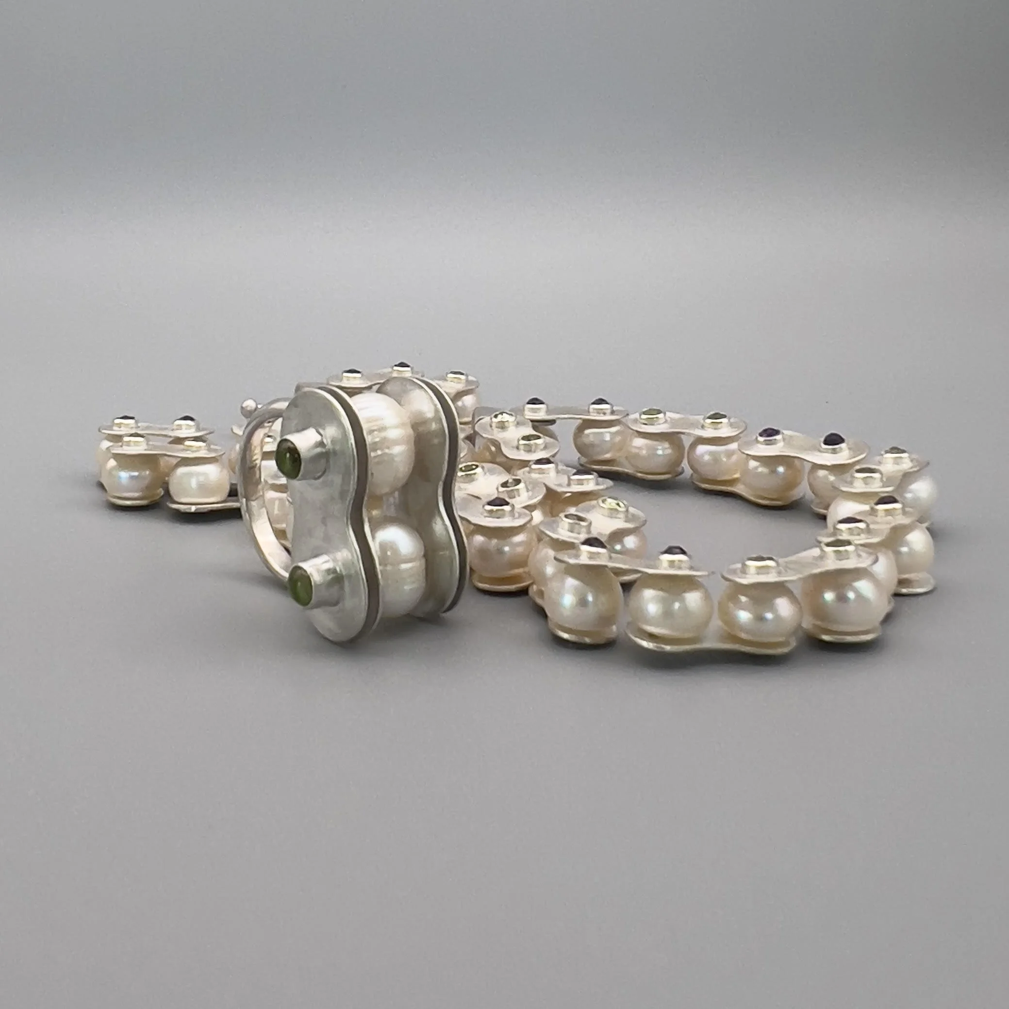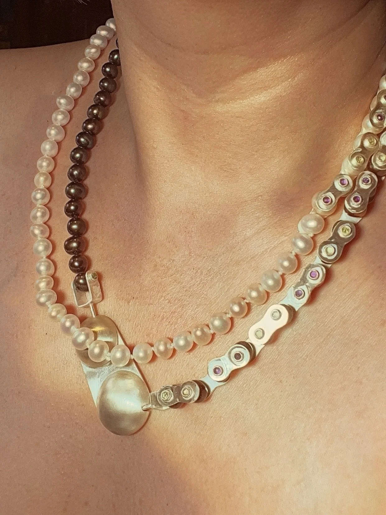 The Resting Bike Face collection is a bold symbol of women's empowerment, inspired by the historical resistance to women cycling, which was once deemed a threat to societal norms. Featuring moving bike chain segments and suffragette colors, it honors the spirit of independence and the fight for equality. Crafted with pearls, peridots, amethysts, and Sterling Silver, it celebrates the resilience and power of women throughout history.Materials: sterling silver, cultured pearls, amethysts and peridots